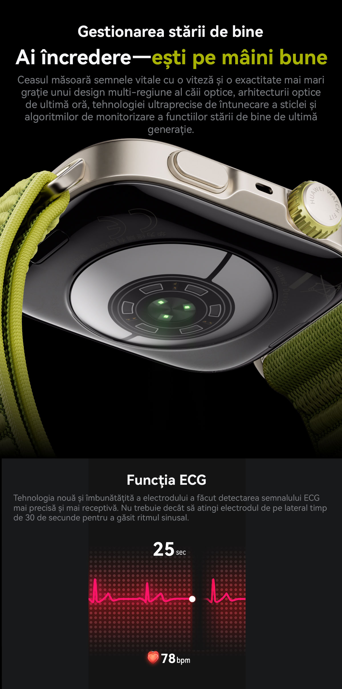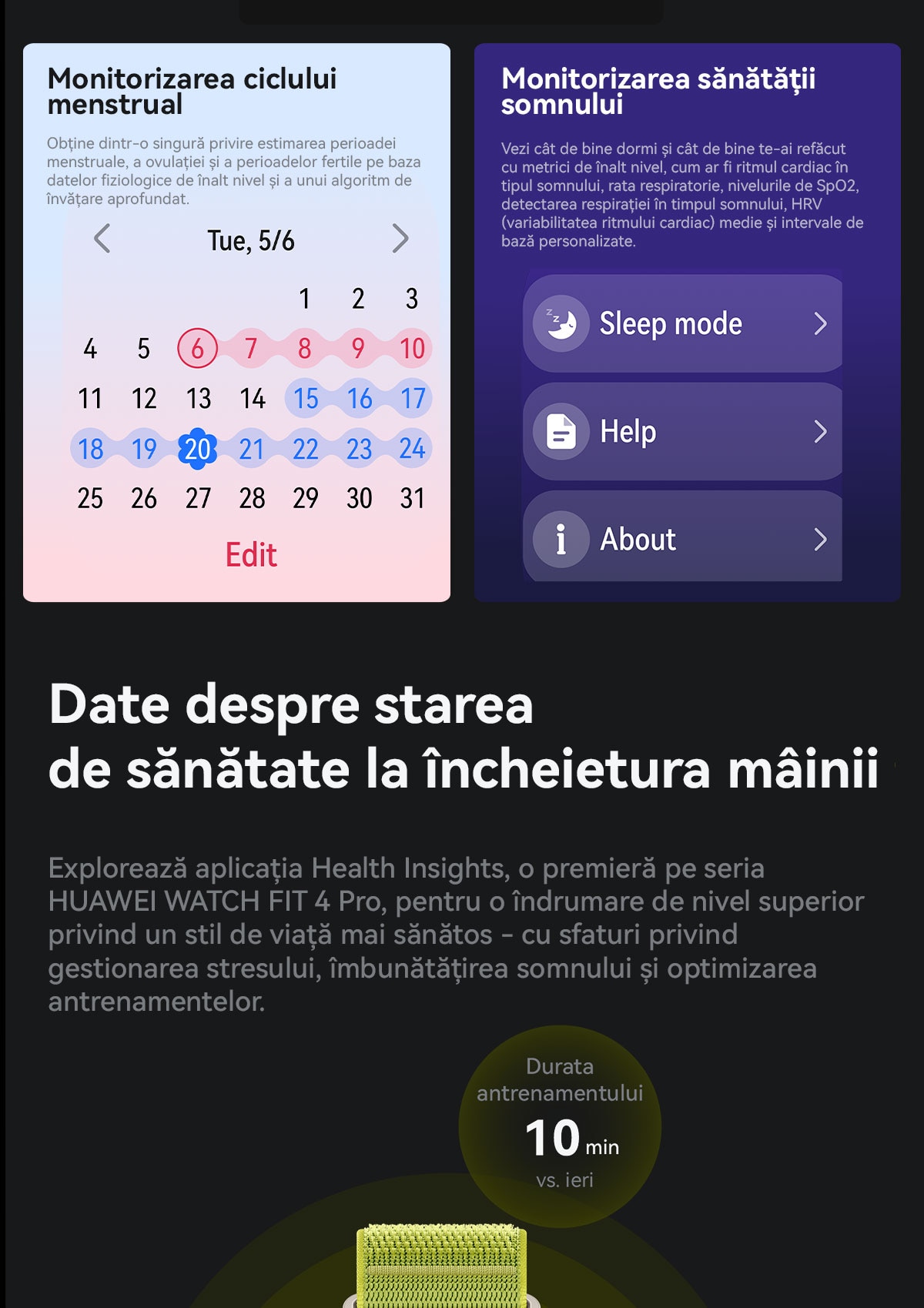 | Activitate monitorizata | Pasi Distanta parcursa Calitatea somnului Monitorizare ritm cardiac Monitorizare menstra Monitorizare nivel stres |