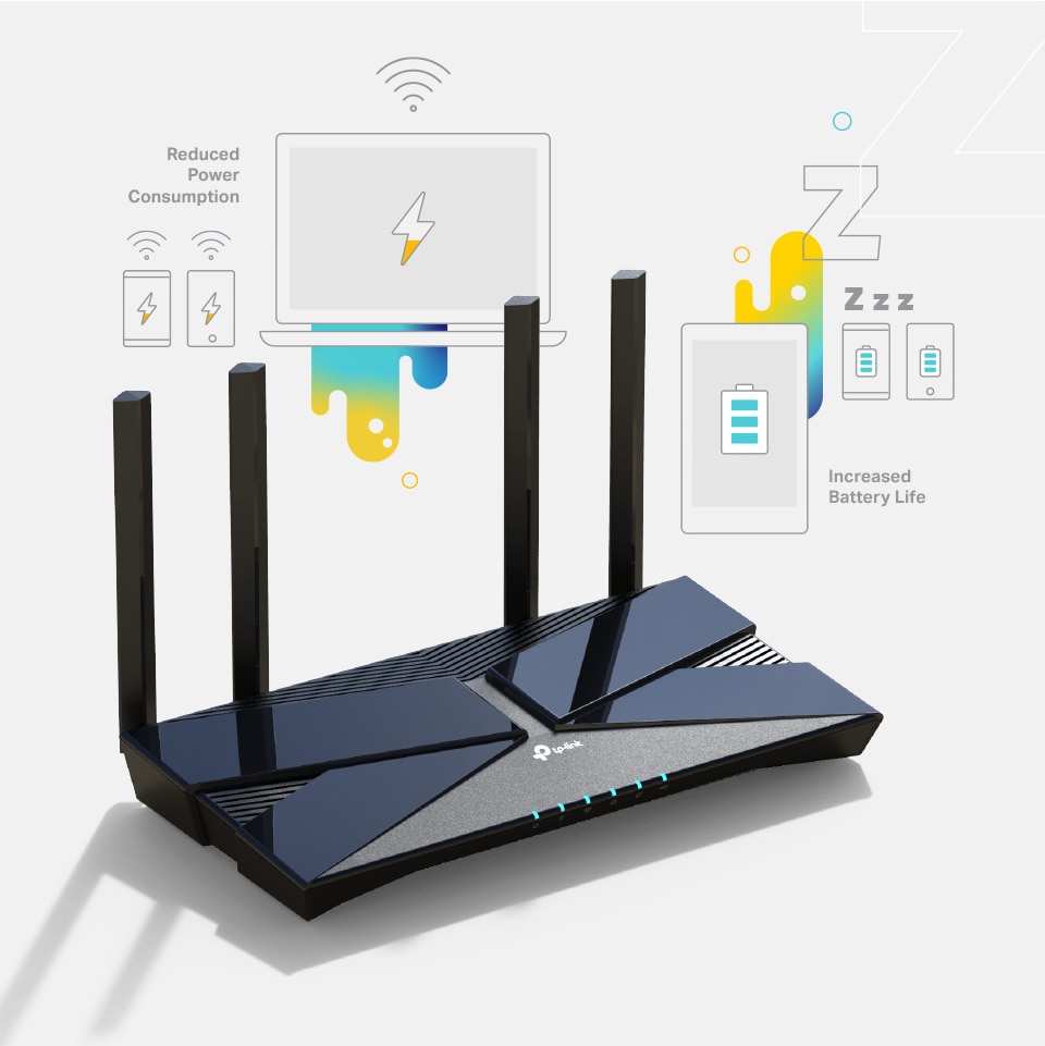 Reduce consumul de energie. Imbunatateste durata de viata a bateriilorTehnologia Target Wake Time (TWT) comunica cu dispozitivele tale si negociaza cand si cat de frecvent ar trebui sa transfere date pentru a creste timpul de repaus al dispozitivului, prelungind durata de viata a bateriei.